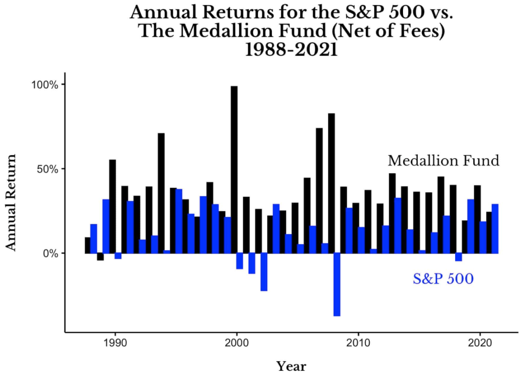 Ao longo dos anos, o Fundo Medallion da Renaissance Technologies consolidou sua reputação como um dos fundos de investimento mais bem-sucedidos do mundo. Seu desempenho anualizado de 62% antes de taxas e 37% líquidos de taxas, entre 1988 e 2021, é simplesmente impressionante.