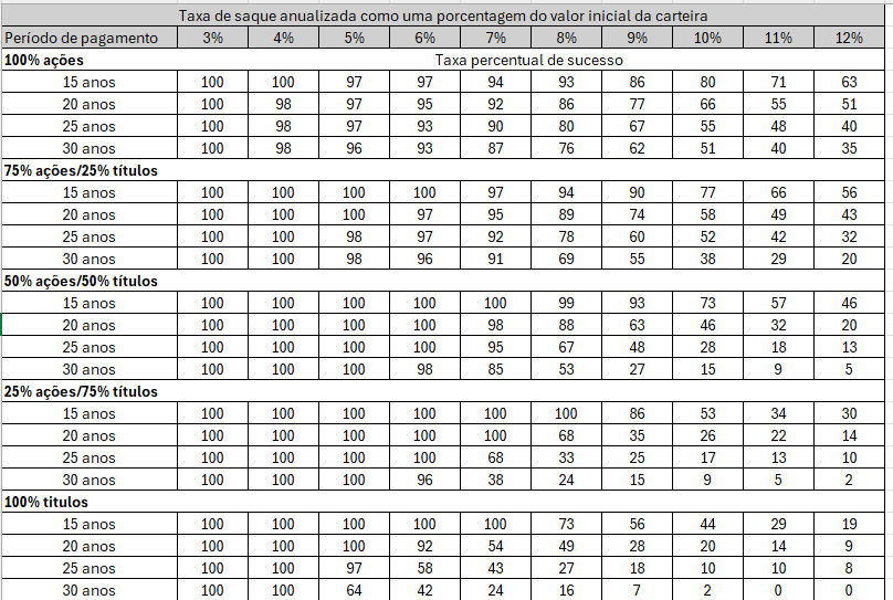 Os autores simularam carteiras que combinavam diferentes percentuais entre ações e títulos e examinaram o quanto restaria de capital nessas carteiras combinando percentuais diferentes de saques e períodos.